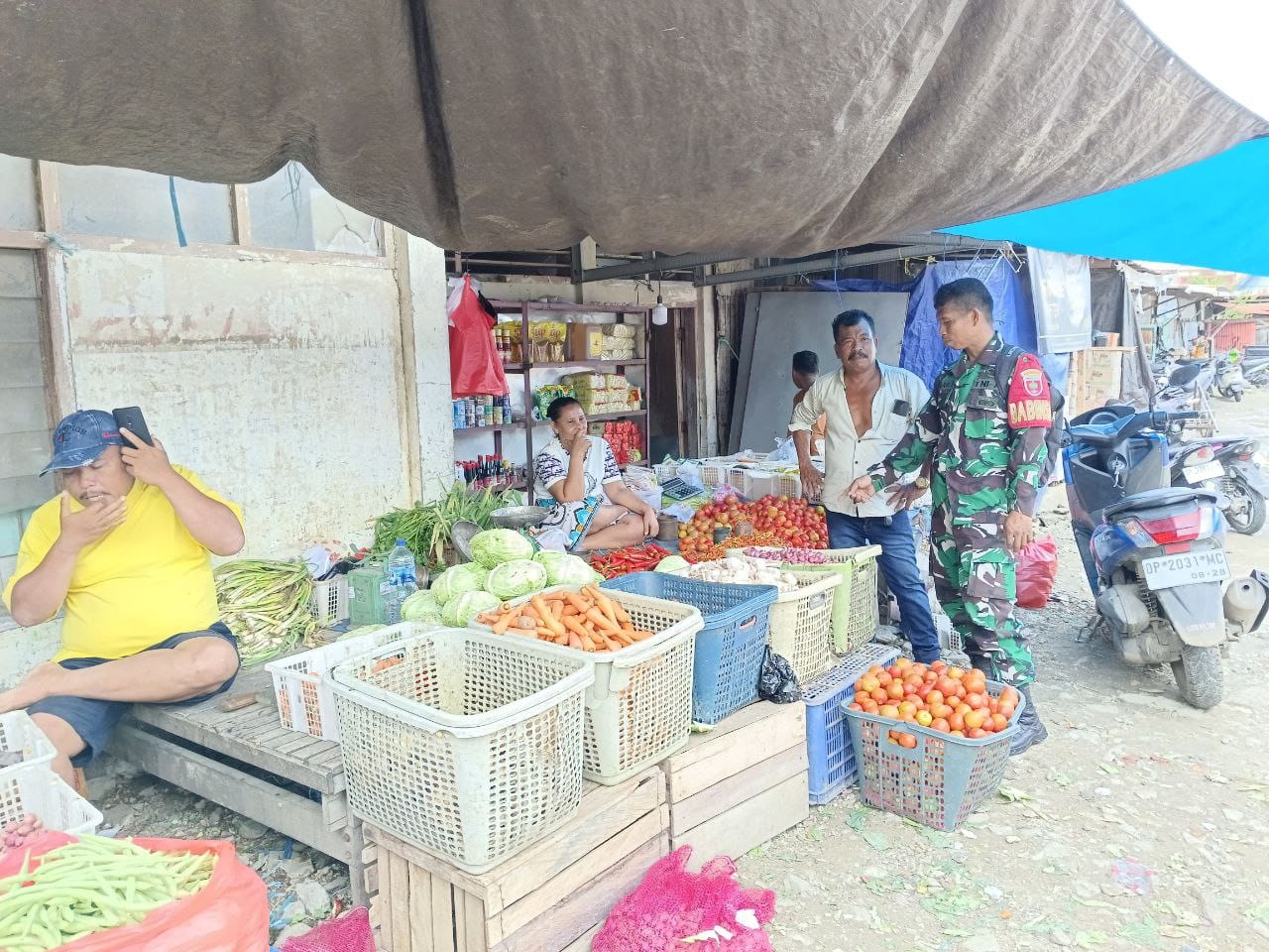 Sidrap, – Menjelang Hari Raya Idul Fitri, Babinsa Koramil 1420-02/Tellu Limpoe, Sertu Anwar, melakukan pemantauan terhadap ketersediaan dan harga bahan pokok di Pasar Sentral Amparita, Kelurahan Toddang Pulu, Kecamatan Tellu Limpoe, Kabupaten Sidrap, Minggu (23/03/2025).