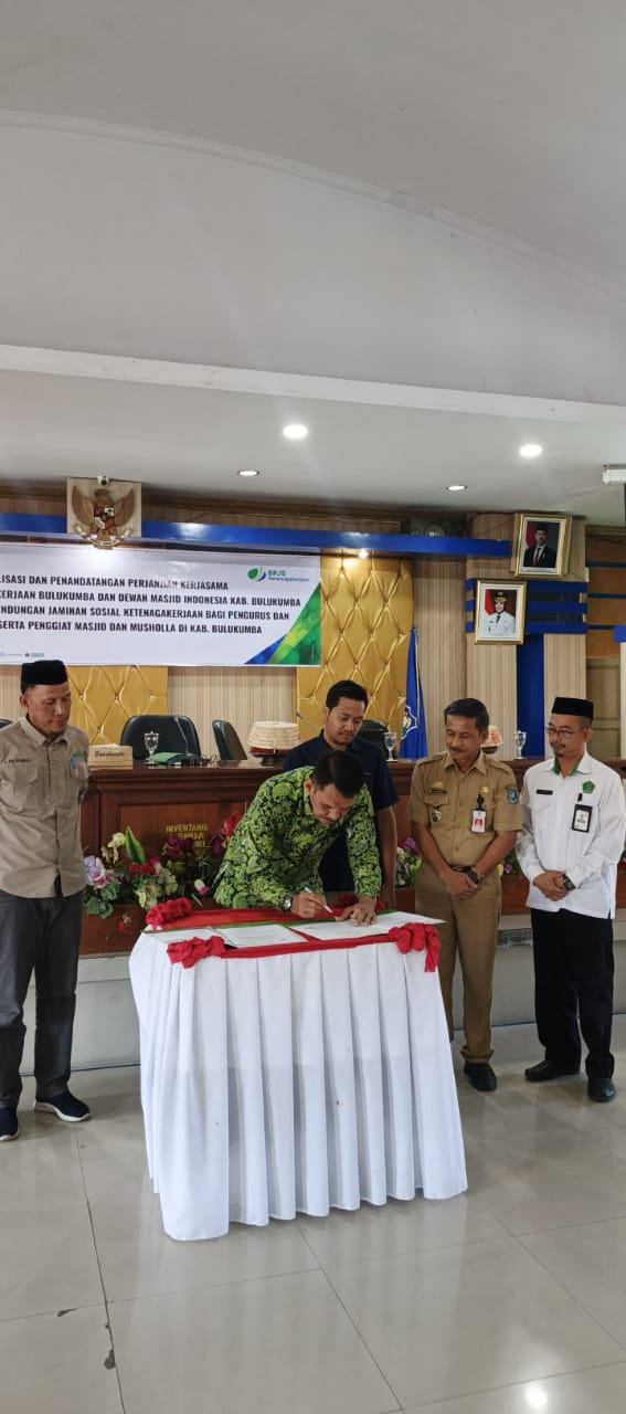 Ketua Dewan Masjid Indonesia (DMI) Kabupaten Bulukumba H.Andi Muttamar Matottorang bersama kepala BPJS ketenagakerjaan Abrianto, S.H., M.H. resmi menandatangani perjanjian kerja sama perlindungan jaminan sosial ketenagakerjaan bagi pengurus DMI, pengurus Masjid,serta penggiat Masjid & Musholla di Kab.Bulukumba.