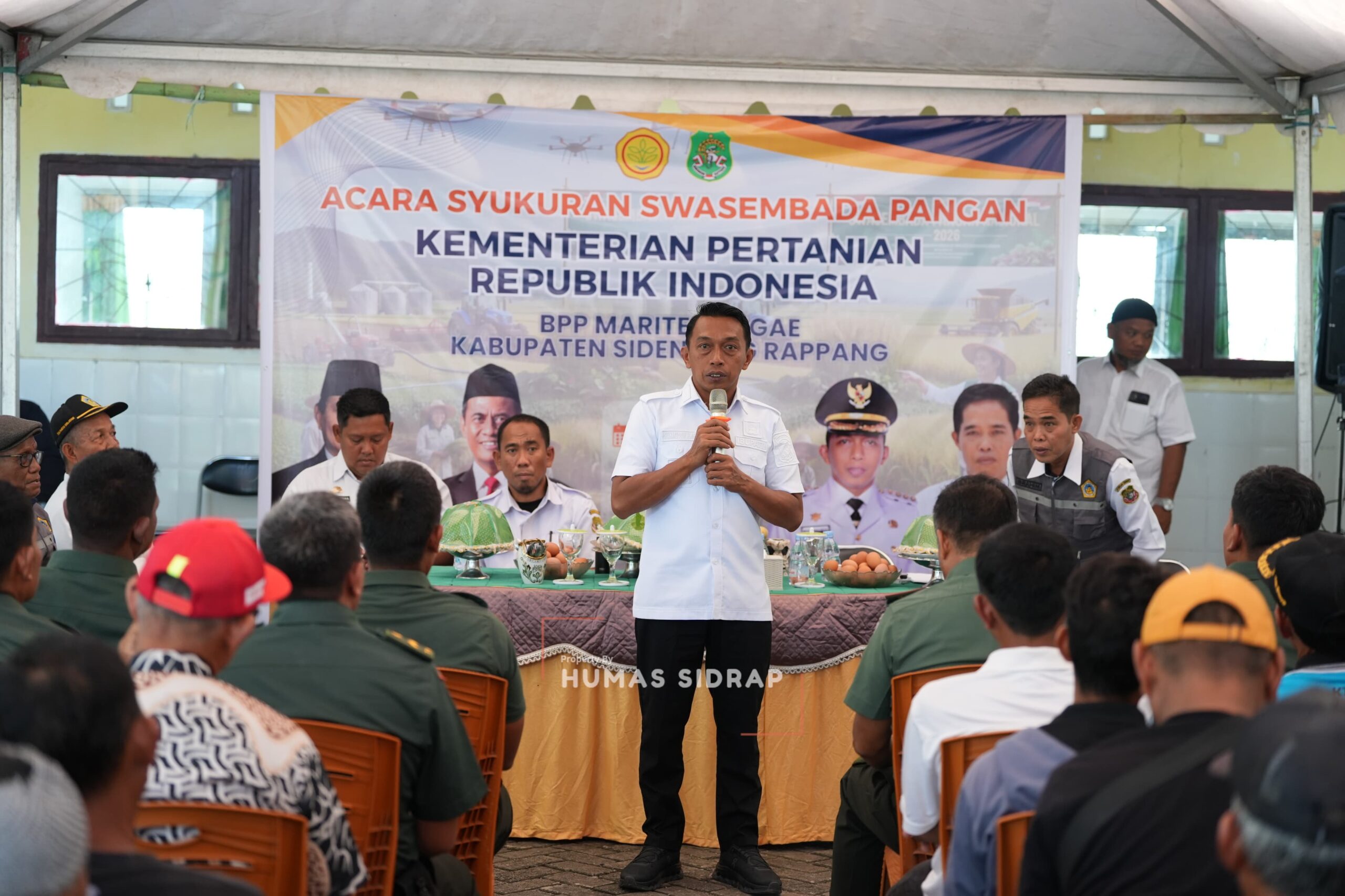 Syaharuddin menyampaikan selamat atas capaian swasembada pangan nasional. Ia juga mengapresiasi dukungan dan bantuan pemerintah pusat pada sektor pertanian Sidrap sepanjang 2025.