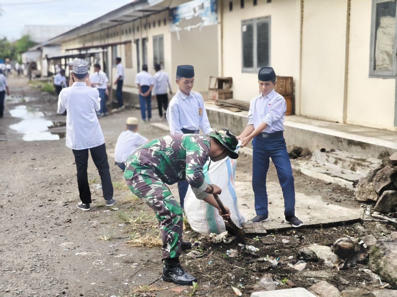 Terlihat personel Babinsa dari Koramil dan para siswa-siswi bahu-membahu membersihkan area pasar, mulai dari sampah-sampah kecil hingga memastikan saluran air terbebas dari penyumbatan yang dapat menyebabkan banjir