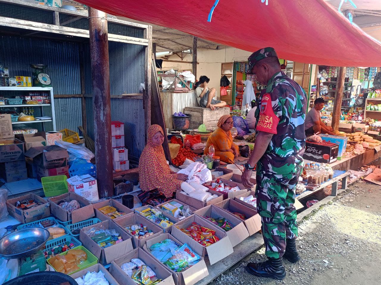 Dalam kegiatannya, Serka Ramli berdialog langsung dengan para pedagang dan pembeli guna menggali informasi terkait harga komoditas utama seperti beras, minyak goreng, gula, serta kebutuhan pokok lainnya.