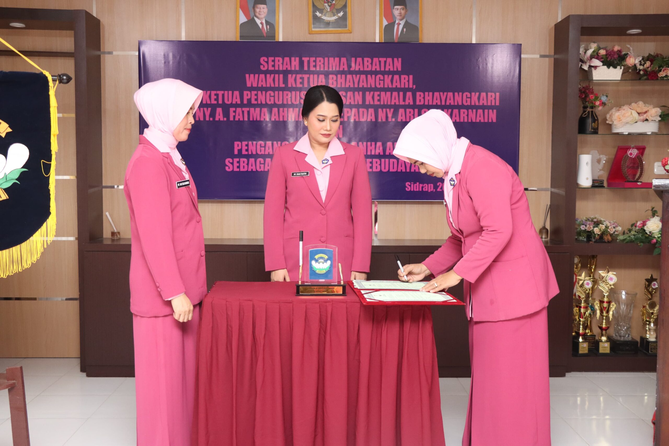 SIDRAP – Ketua Bhayangkari Cabang Sidrap, Ny. Dian Fantry, memimpin langsung Serah Terima Jabatan (Sertijab) Wakil Ketua Bhayangkari serta Wakil Ketua Pengurus Yayasan Kemala Bhayangkari dari Ny. A. Fatma Ahmad kepada Ny. Ani Zulkarnain. Dalam kesempatan yang sama, Ny. Anha Abang resmi diangkat sebagai Ketua Seksi Kebudayaan Bhayangkari Cabang Sidrap.