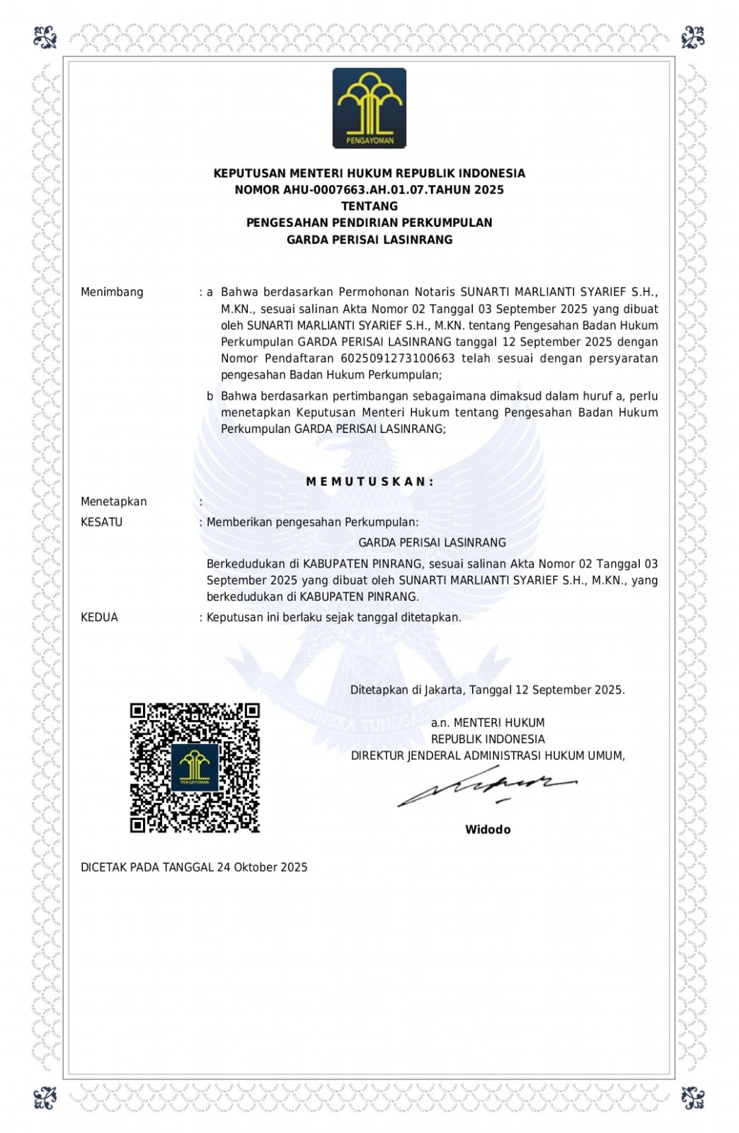 Untuk diketahui Surat keputusan Menkumham dengan Nomor AHU-000766.AH.07.TAHUN2025 Tentang Pengesahan Pendirian Perkumpulan Garda Perisai Lasinrang.