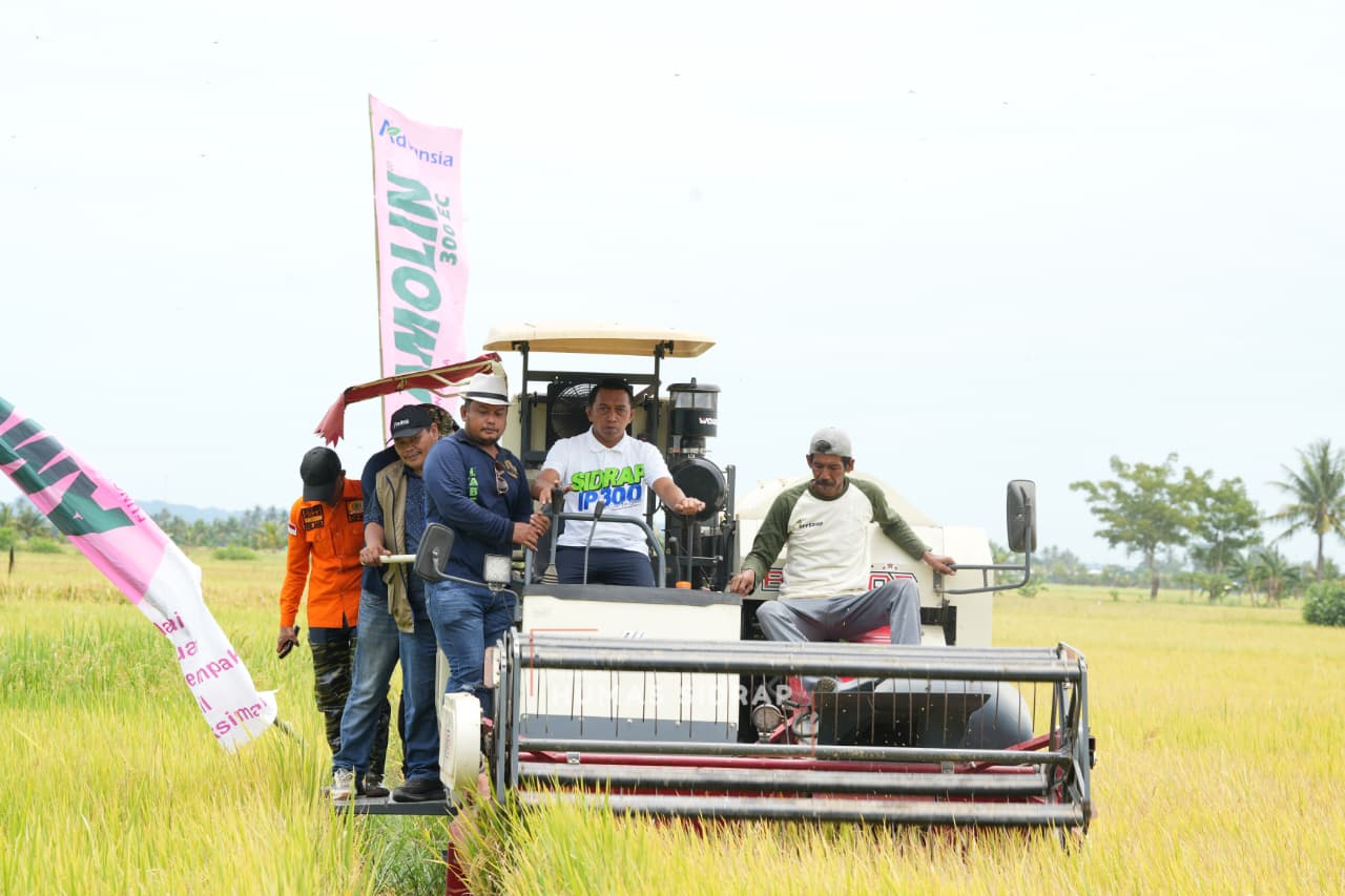 Prosesi panen raya ditandai dengan pengoperasian alat mesin pertanian (alsintan) modern jenis combine harvester oleh Bupati Sidrap untuk mempercepat proses panen.