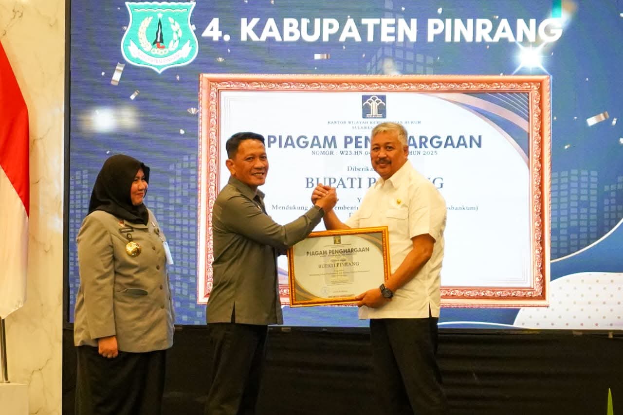 Atas komitmen dan upaya tersebut, Pemerintah Kabupaten Pinrang menerima penghargaan bersama 17 kabupaten/kota lainnya di Sulawesi Selatan dari Kementerian Hukum RI.