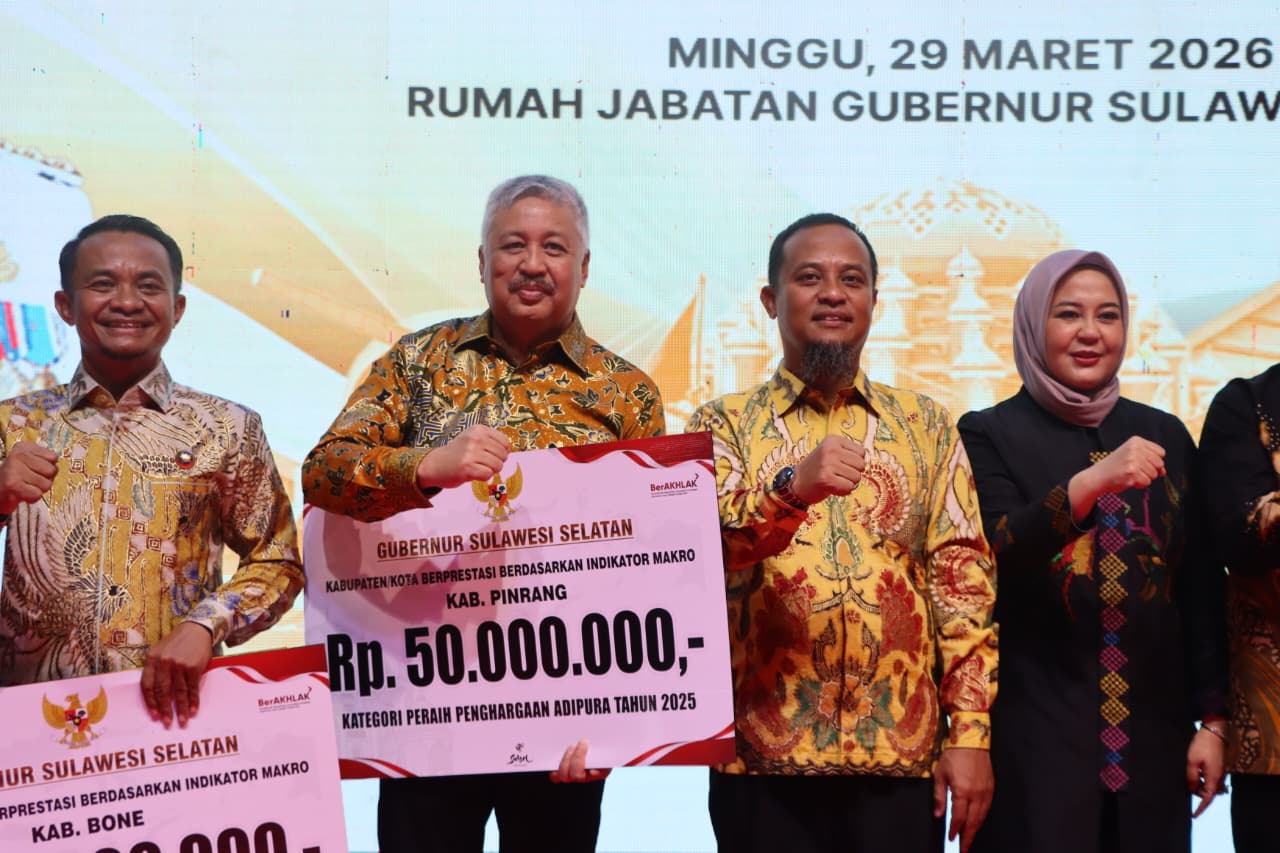 Penghargaan ini diserahkan langsung oleh Gubernur Sulawesi Selatan, A. Sudirman Sulaiman, kepada Bupati Pinrang, H. A. Irwan Hamid, S.Sos., atas prestasi yang diraih sebagai Kabupaten penerima piagam penghargaan Adipura dari Kementerian Lingkungan Hidup.