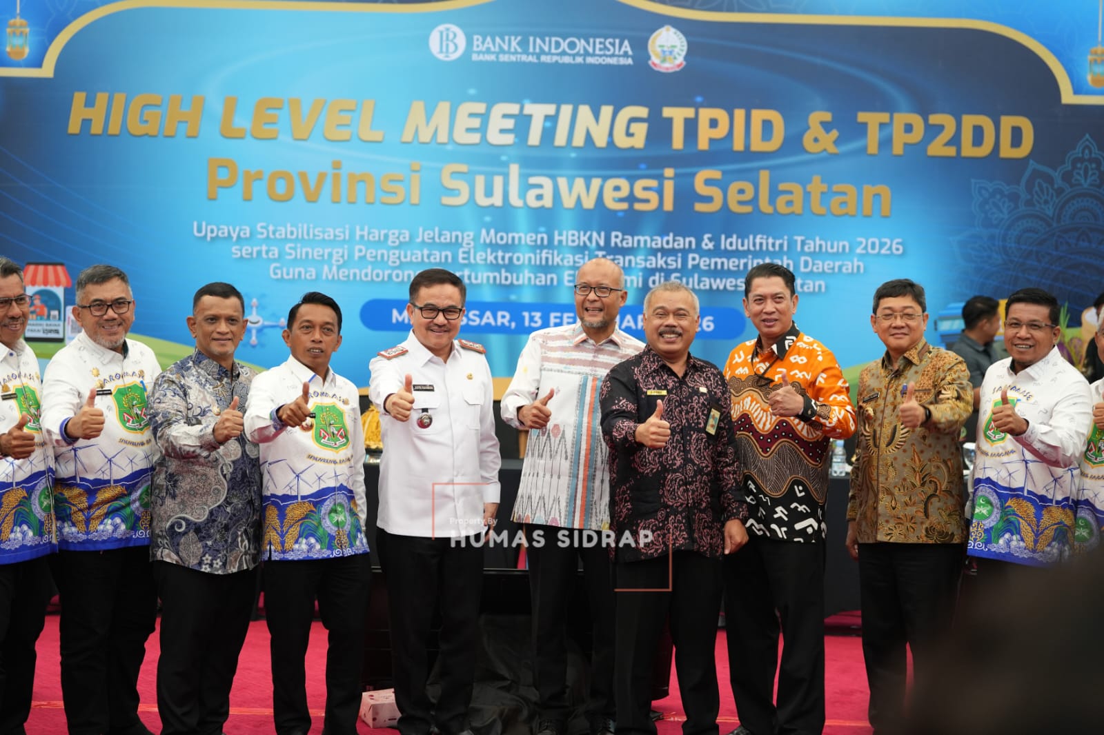 Bupati Sidrap Syaharuddin Alrif menghadiri High Level Meeting (HLM) Tim Pengendalian Inflasi Daerah (TPID) dan Tim Percepatan dan Perluasan Digitalisasi Daerah (TP2DD) Provinsi Sulawesi Selatan periode Januari 2026 di Ruang Pola Kantor Gubernur, Jumat (13/2/2026).
