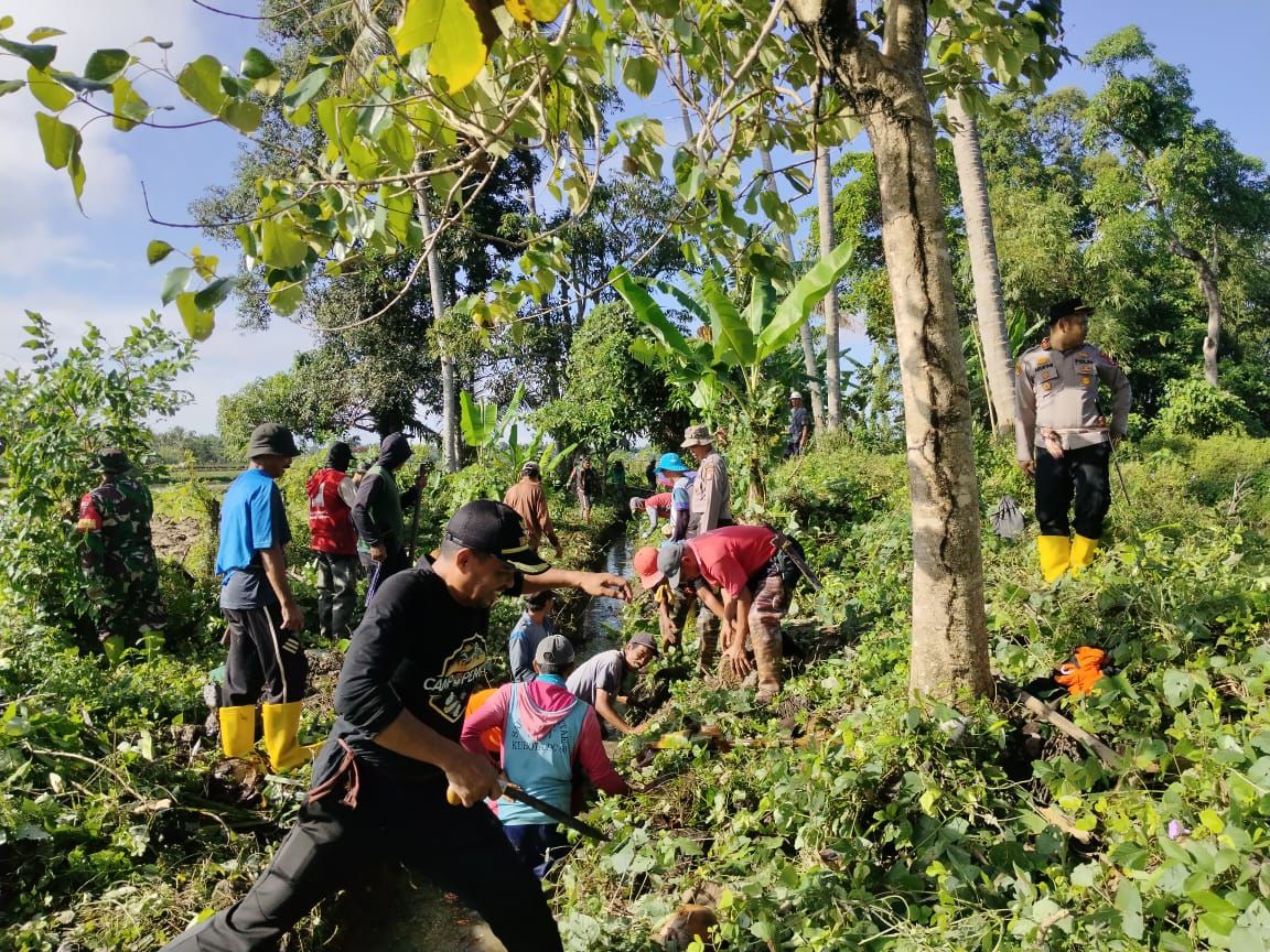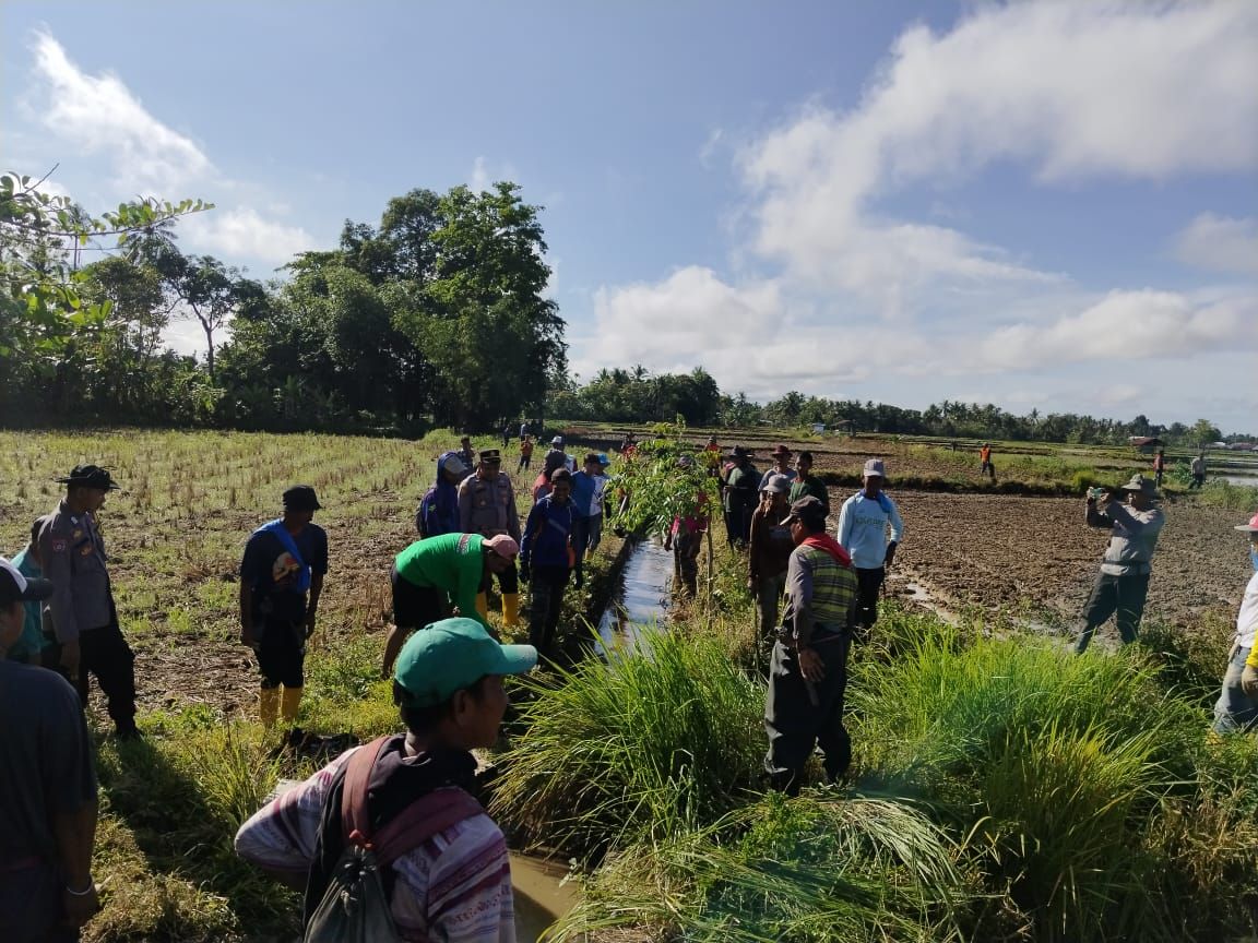 Kegiatan pembersihan saluran irigasi di hadiri Camat, anggota Polsek, anggota kelompok tani dan anggota penggiat kebersihan lingkungan secara bersama-sama agar aliran air ke sawah dapat di manfaatkan para petani dengan baik.