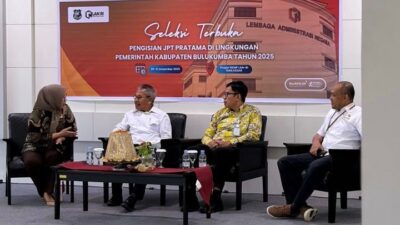 Bulukumba,- Pemerintah Kabupaten Bulukumba memulai tahapan Seleksi Terbuka Pengisian Jabatan Pimpinan Tinggi (JPT) Pratama di Lingkungan Pemerintah Kabupaten Bulukumba yang berlokasi di Pusat SKMP LAN-RI Makassar, Senin, 29 Desember 2025.