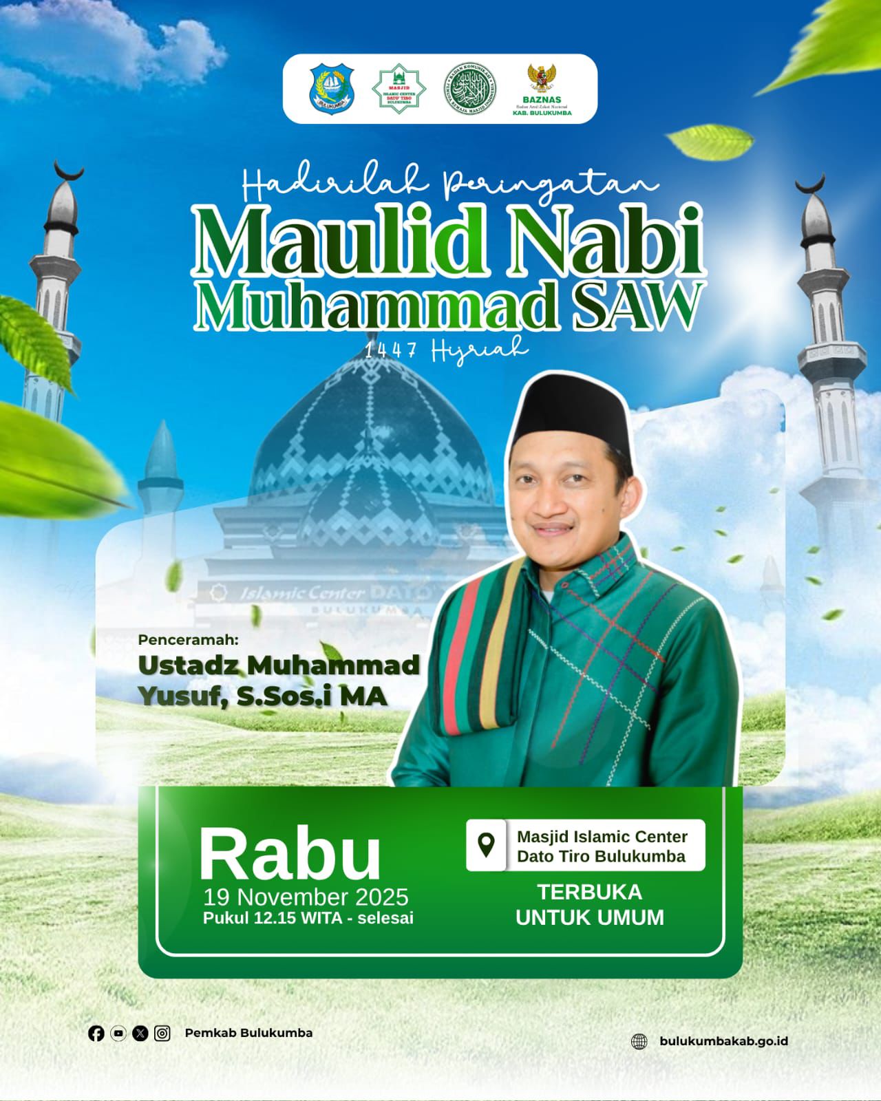 Bulukumba — Ustadz Muhammad Yusuf, mubalig kondang yang dikenal luas melalui kanal Ceramah Bugis di media sosial, dijadwalkan hadir memberikan tausiyah pada peringatan Maulid Nabi Besar Muhammad SAW 1447 Hijriah di Masjid Islamic Center Dato’ Tiro (ICDT) Bulukumba, Rabu, 19 November 2025, ba’da Zuhur mendatang.