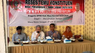 WAJO – Ketua DPRD Kabupaten Wajo, H. Firmansyah Perkesi, kembali turun langsung menemui masyarakat dalam masa resesnya. Kali ini, politisi Partai Gerindra itu menyambangi warga Jalan Bhayangkara, Kelurahan Paduppa, Kecamatan Tempe, pada Kamis (30/10/2025).