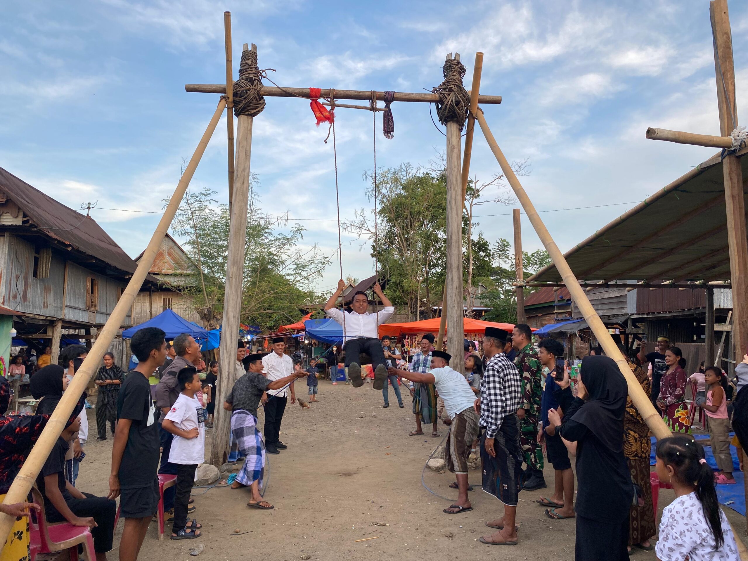 Acara yang digelar oleh Wa Sadaria sebagai tuan rumah juga diisi tradisi mattojang. Bupati Syaharuddin Alrif turut mencoba ayunan ukuran besar tersebut.